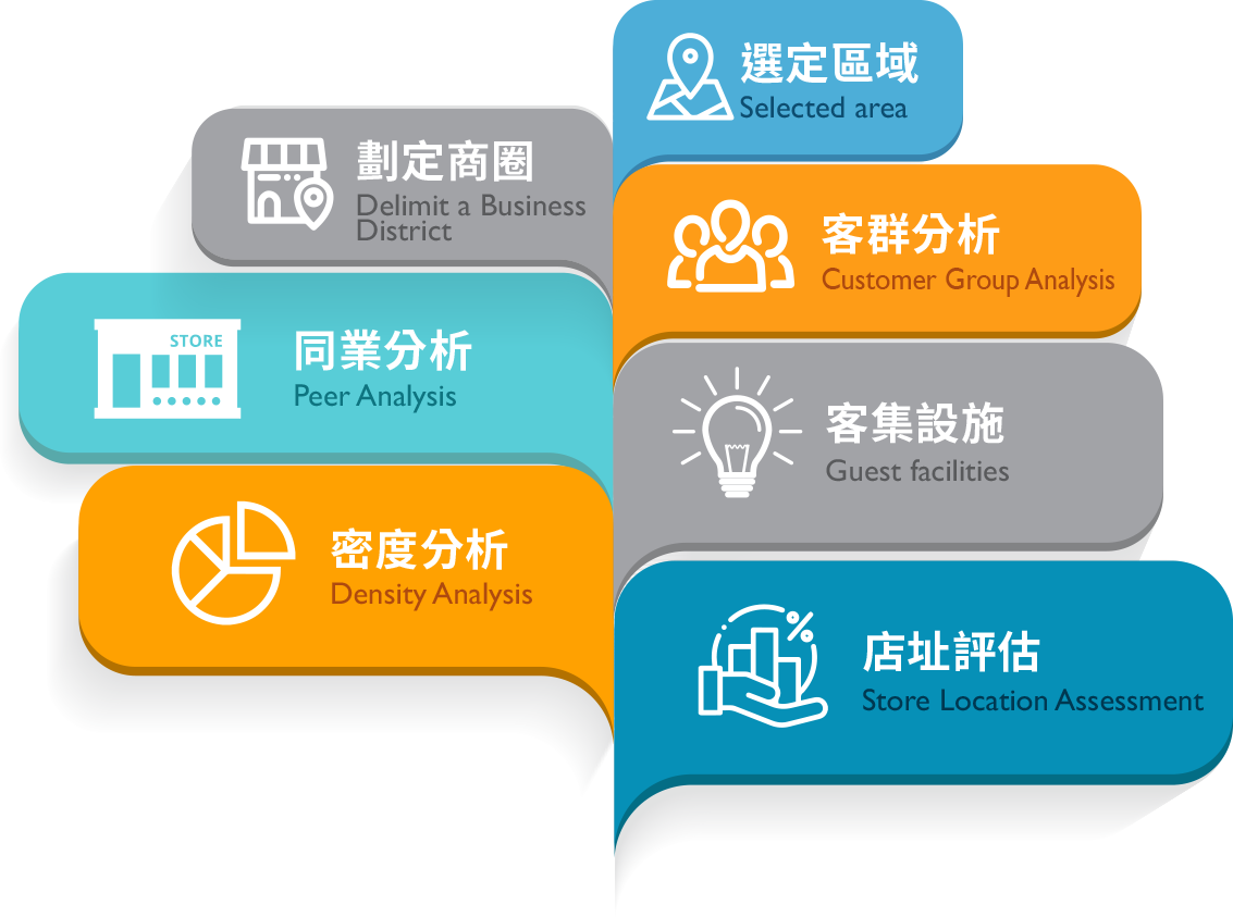 單店在該區域成功開店,品牌連鎖關鍵在複 製成功,展店人員若能將此選址模型化,便 能在快速變遷的市場正確決策上,這也是品 牌連鎖的核心競爭力之一。宸昊團隊可協助 您建置成功店模型,精準有效找出極具潛力 的商圈店鋪以及提升現有店的質量。